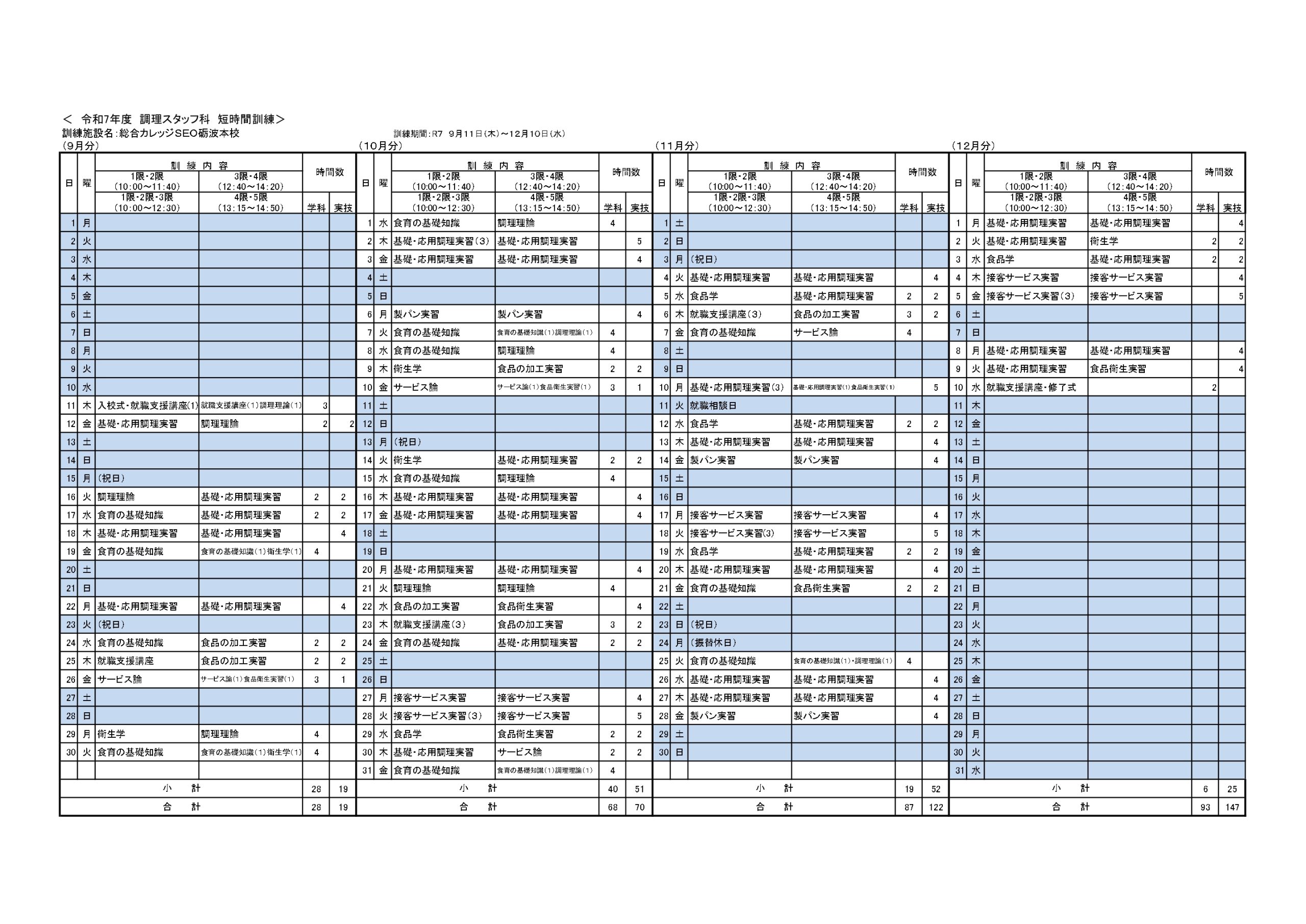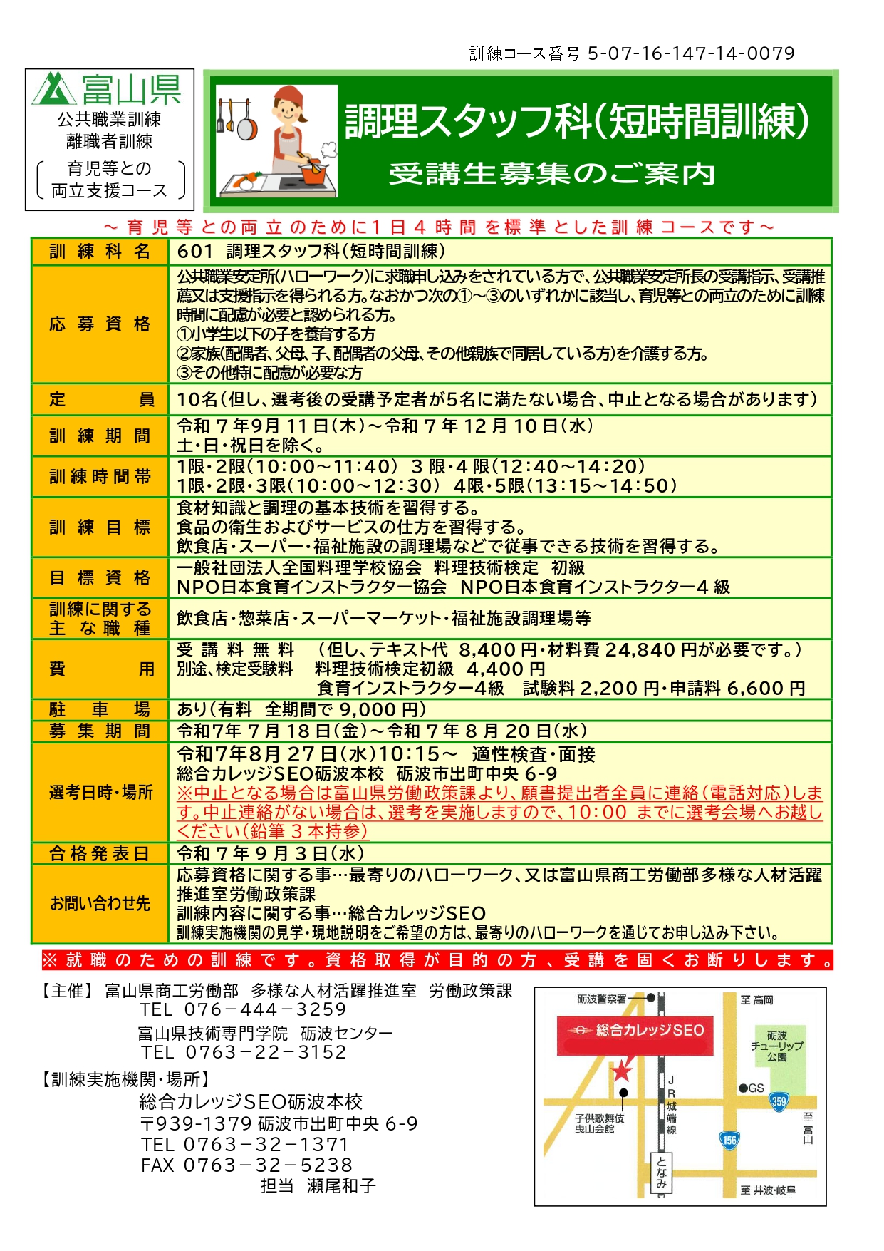 > (砺波校)公共職業訓練離職者訓練調理スタッフ科受講生募集のご案内