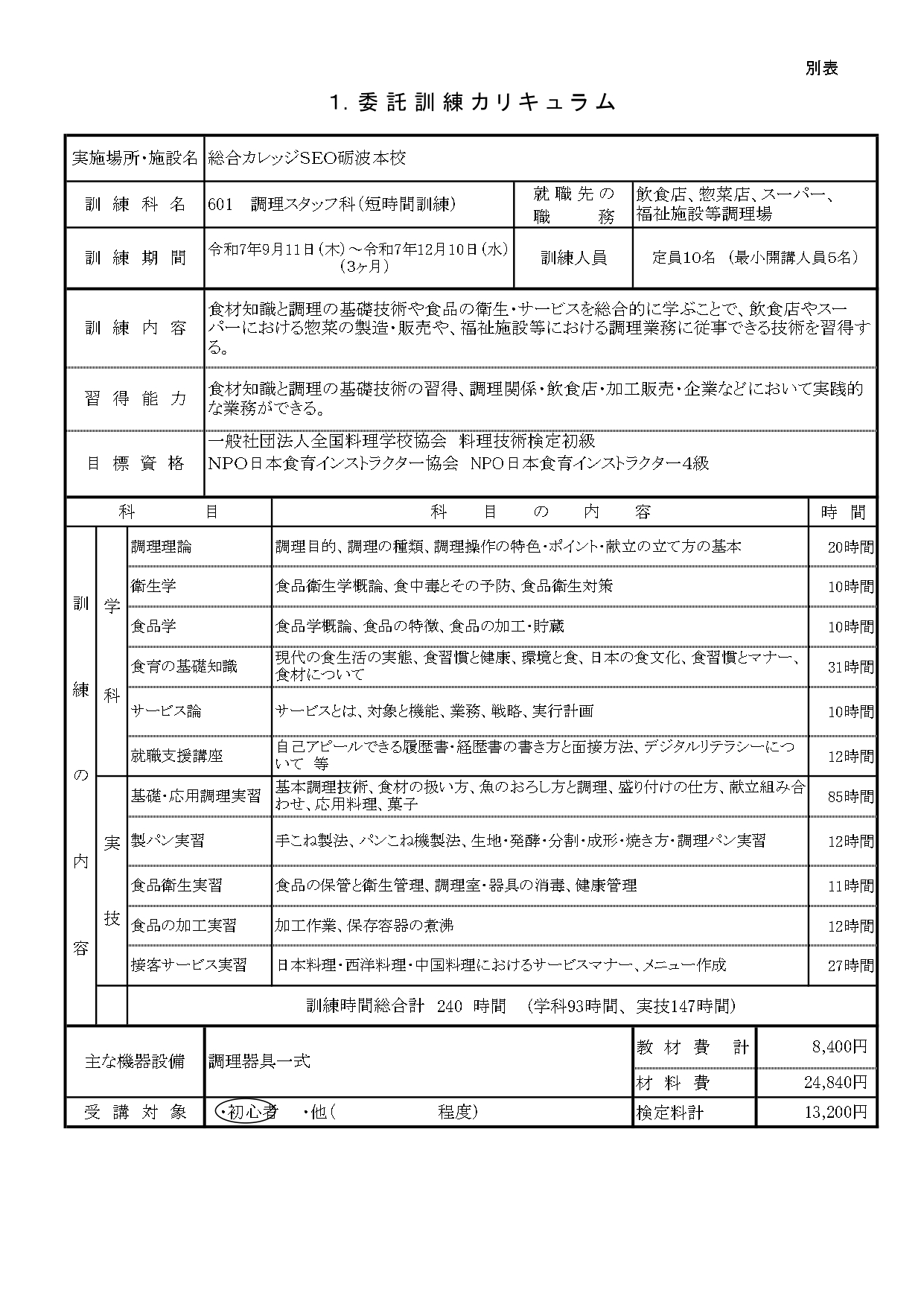 (砺波校)公共職業訓練離職者訓練調理スタッフ科受講生募集のご案内