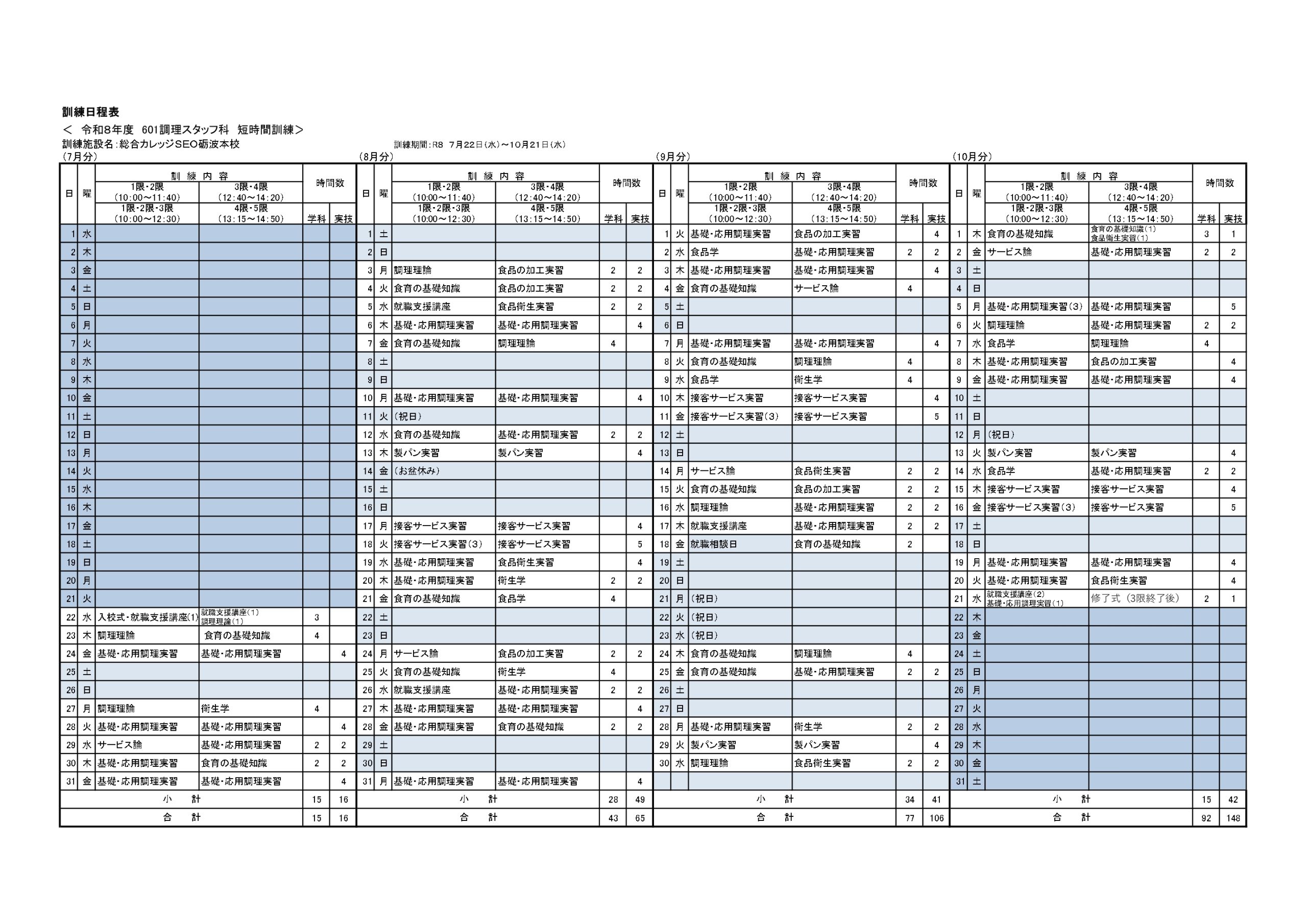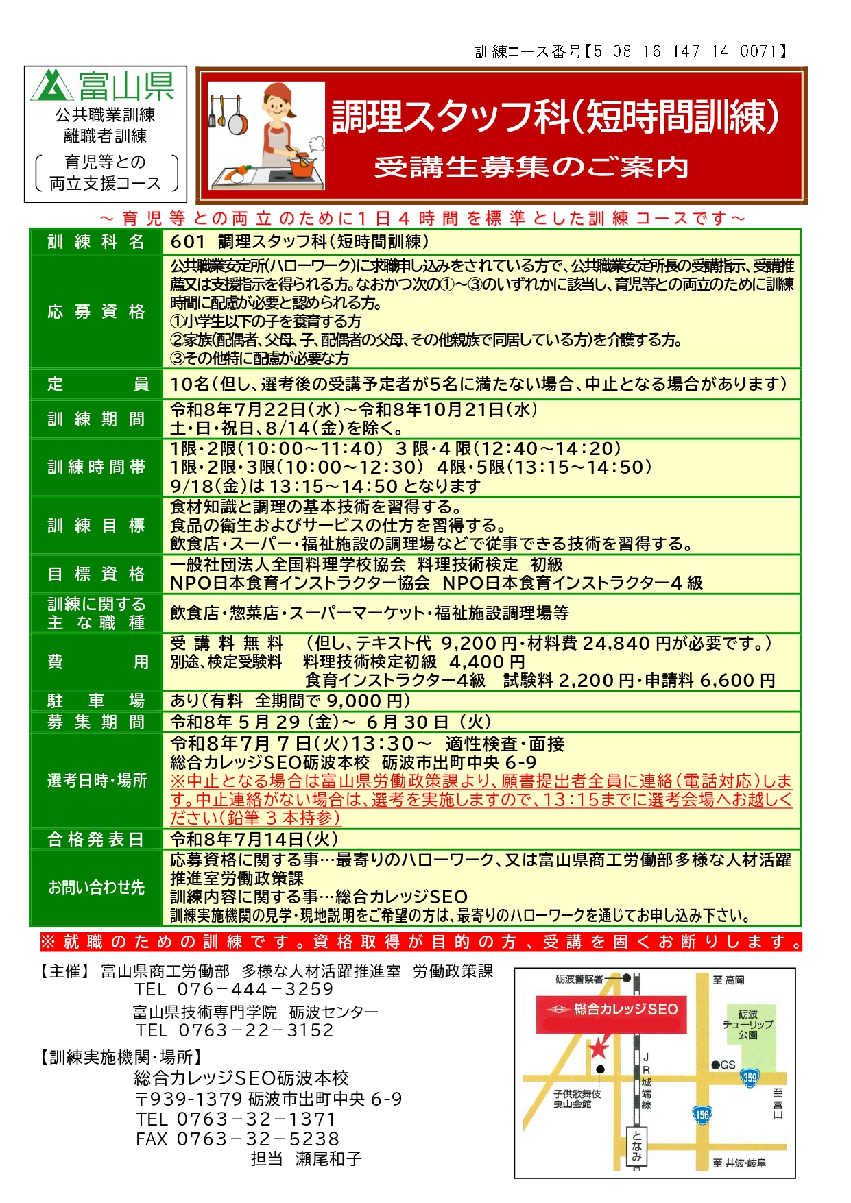 > 職業訓練 調理スタッフ科(短時間訓練)砺波校 受講生募集!