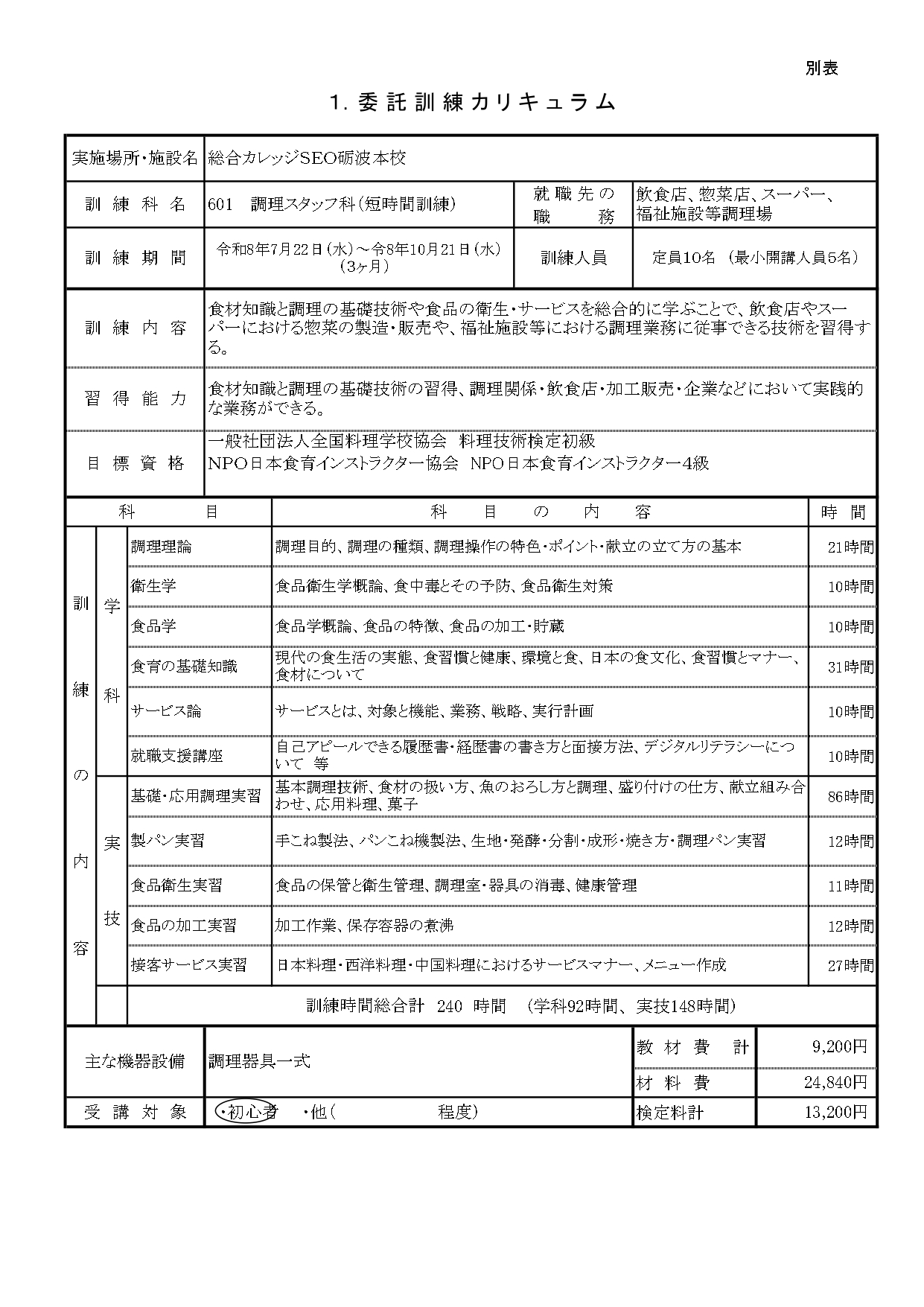 職業訓練 調理スタッフ科(短時間訓練)砺波校 受講生募集!